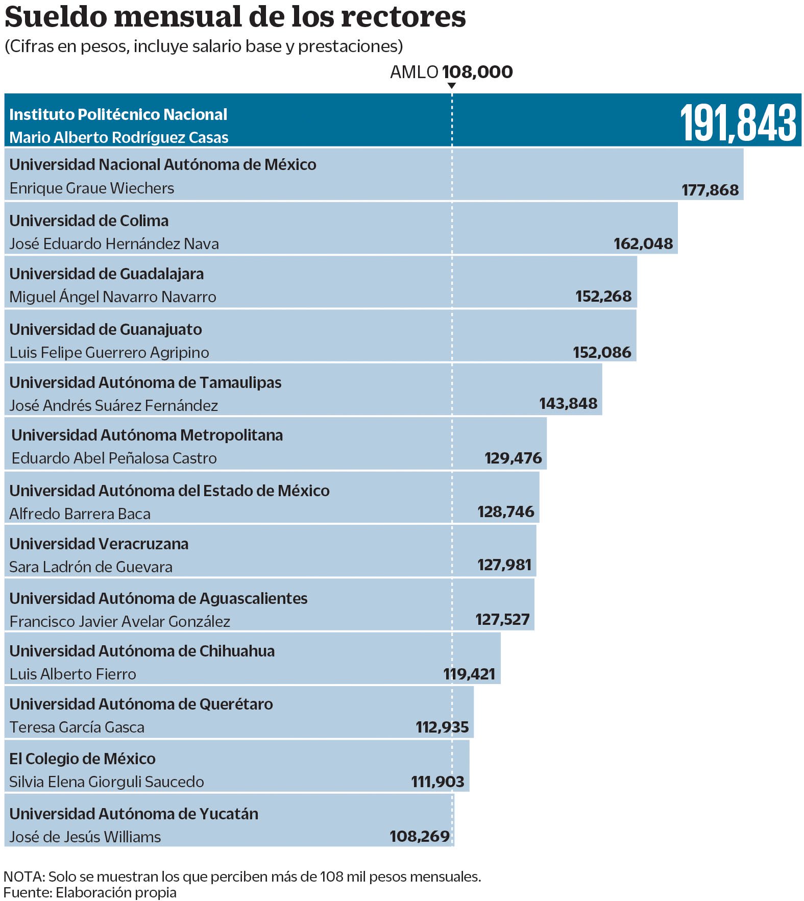 A su vez, Enrique Graue Wiechers, rector de la Universidad Nacional Autónoma de México (UNAM), percibe 177 mil 868 pesos, de los cuales 54 mil 553 recibe de su salario y 126 mil 341 son percepciones adicionales.