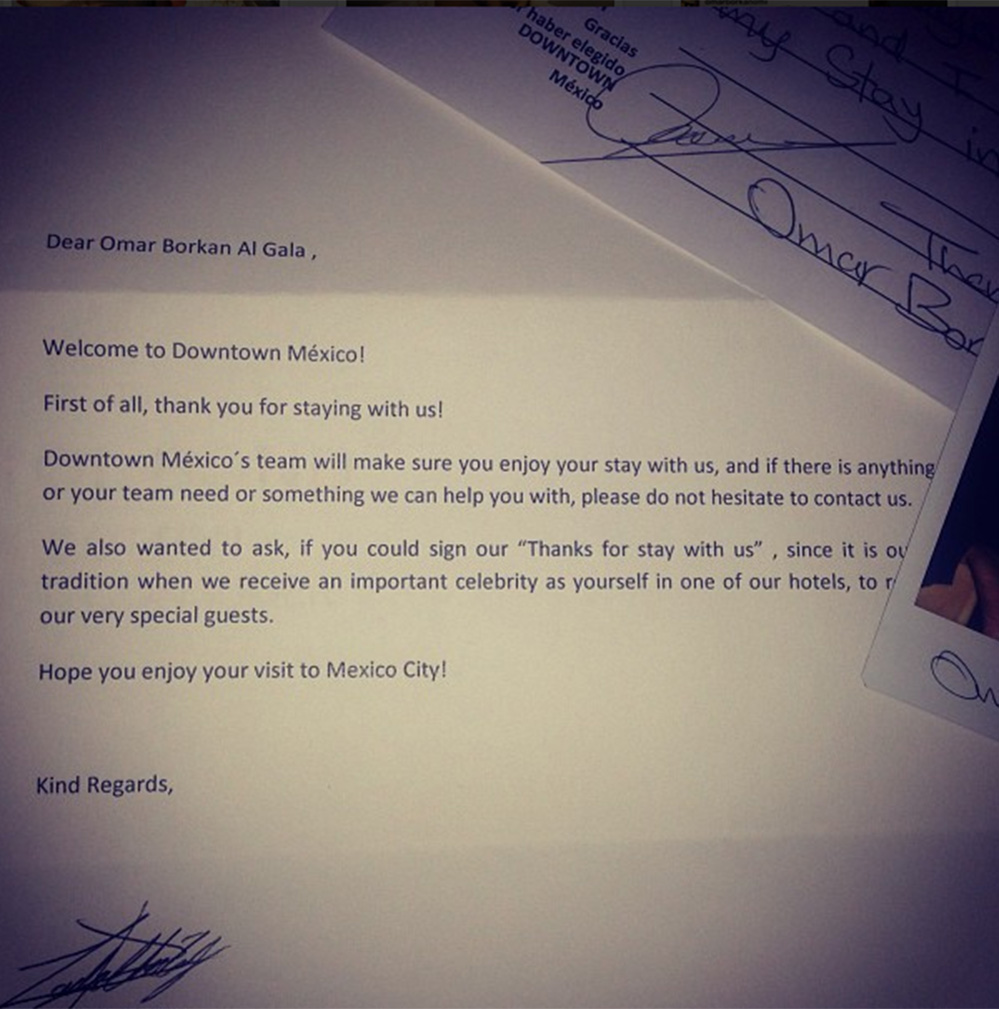 El Hotel le dio una carta de bienvenida y también él lo comentó en Twitter. El día 19 a las 23 horas salió rumbo a Toronto.