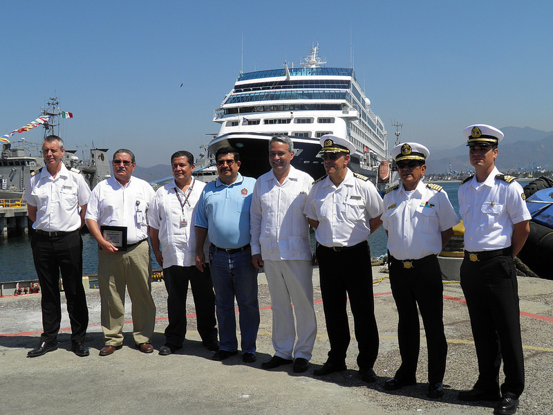 A su llegada el secretario de Turismo el Gobierno del Estado, Héctor Sandoval Fierros; el capitán de Puerto, Idelfonso Carrillo Mora; el representante del director de la API, Juan Manuel de los Santos; el síndico municipal, Gonzalo Medina y el capitán del Crucero, José Manuel Vilarinho Neves, intercambiaron placas conmemorativas.