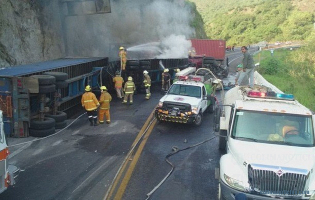 México.- Debido al choque e incendio de dos tráilers, esta mañana permanece cerrada en su totalidad la circulación sobre la autopista Guadalajara-Colima a la altura de Cuatro Caminos en el municipio de Tuxpan.