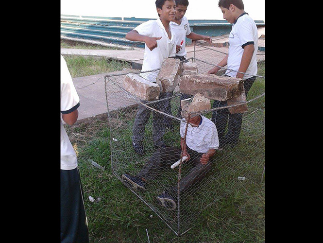 El pasado lunes 30 de junio, por la tarde, en la secundaria federal de la colonia El Cerrito, alumnos del segundo grado sujetaron a su compañero Kevin.