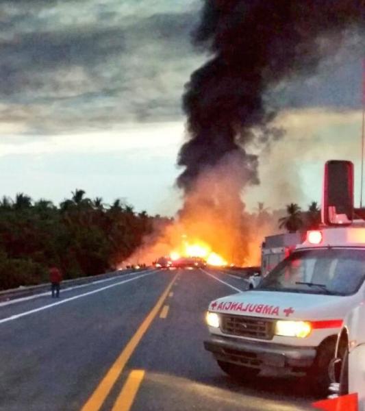 14/04/2017.- Un vehículo doble remolque que transportaba gasolina chocó de frente contra un autobús rentado por una familia que partió de Morelia en dirección a Lázaro Cárdenas. Los 40 mil litros que el doble remolque cargaba generaron una explosión en el kilómetro 300 de la Autopista Siglo XXI.