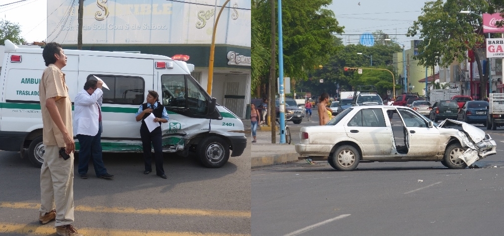 Tecoman, Col.– Daños materiales que aún no han sido cuantificados y dos personas lesionadas, fue el saldo de un fuerte choque entre una ambulancia del seguro social y un vehículo Tsuru, en hechos que se registraron al filo de las 6 de la tarde de este jueves por la avenida Insurgentes.