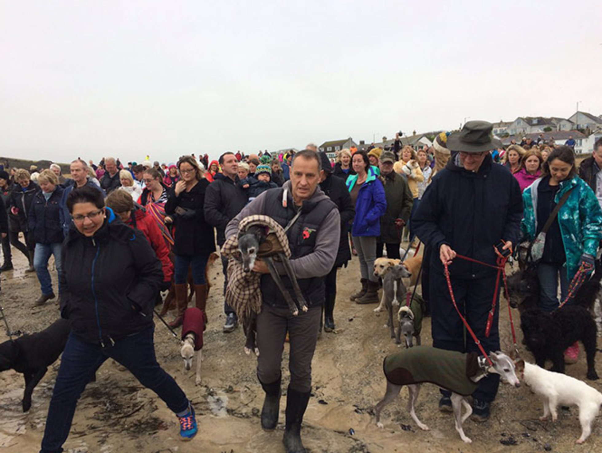 El mensaje inmediatamente se volvió viral y cuando Wood y Walnut llegaron a la playa, cientos de personas acompañadas con sus perros se encontraban en el lugar para acompañarlos en su último paseo por la playa.