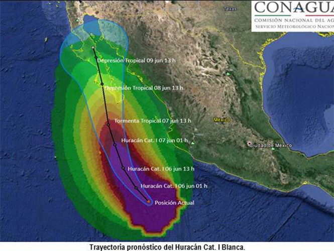 La Unidad Estatal de Protección Civil (UEPC) informa que debido a que el huracán Blanca, el cual actualmente es categoría, se ubica aproximadamente a 535 kilómetros (km) al suroeste de Manzanillo, Colima, y a 880 km al sur-sureste de Cabo San Lucas, Baja California Sur, con vientos máximos sostenidos de 150 kilómetros por hora (km/h), rachas de hasta 185 km/h y desplazamiento hacia el Noroeste a 15 km/h.