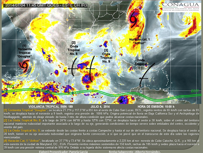En las últimas horas la tormenta tropical Douglas, mantuvo vientos y rachas en Baja California Sur, y habrá potencial de lluvias fuertes en esa entidad, así como en Baja California y Sonora.