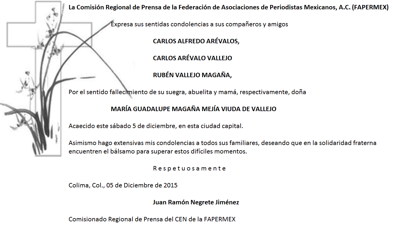 CONDOLENCIA, MARÍA GUADALUPE MAGAÑA MEJÍA VIUDA DE VALLEJO