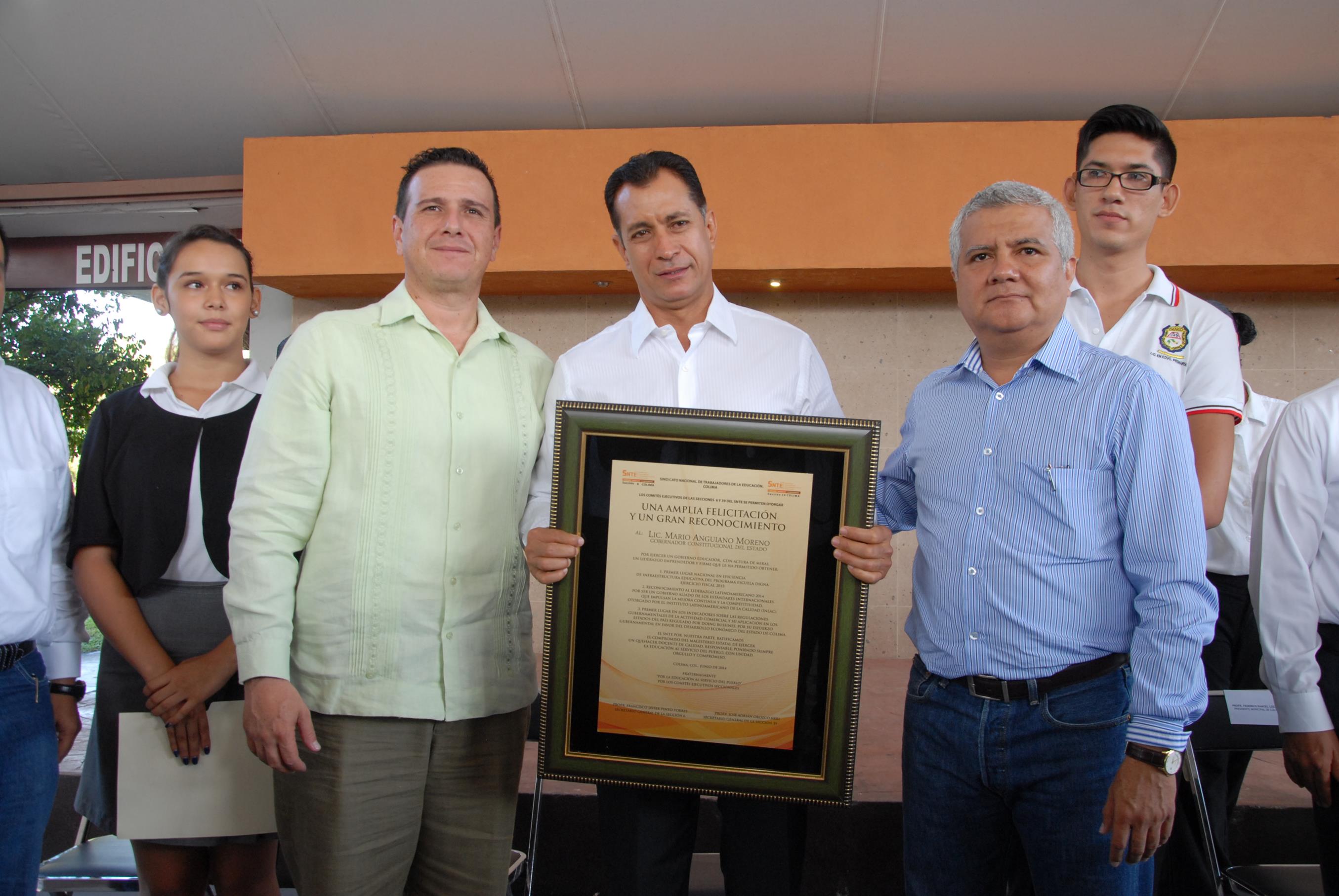 Finalmente los dirigentes de la Sección 6 y 39 del SNTE, Francisco Javier Pinto Torres y José Adrián Orozco Neri, respectivamente, entregaron un reconocimiento al gobernador Mario Anguiano por ejercer un gobierno educador y por colocar a Colima a nivel nacional a la vanguardia en materia educativa.