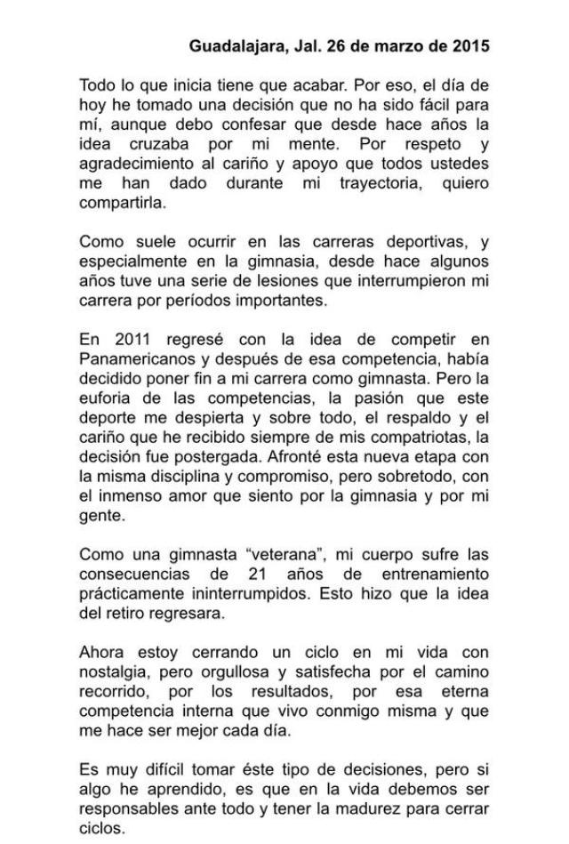 La gimnasta rítmica mexicana anunció su retiro del deporte para comenzar su carrera en la política mexicana, en la que buscará ser regidora del Ayuntamiento de Guadalajara en las elecciones del próximo 7 de abril por el Partido Revolucionario Institucional (PRI).