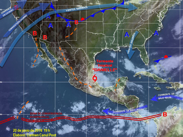 (20/JUN/2016).- A las 19:00 horas la tormenta tropical “Danielle” tocó tierra en los municipios de Tamiahua y Tuxpan, en Veracruz; la zona de prevención por efectos de la tormenta tropical se ha establecido desde Laguna Verde, Veracruz hasta Río Pánuco, en ese estado.