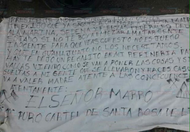En la manta, firmada presuntamente por “El Señor Marro”, supuesto líder del “Cártel de Santa Rosa de Lima”, se le pide al mandatario federal terminar los operativos contra el robo de combustible y sacar las Fuerzas Armadas del estado, de acuerdo a información difundida por Forbes.