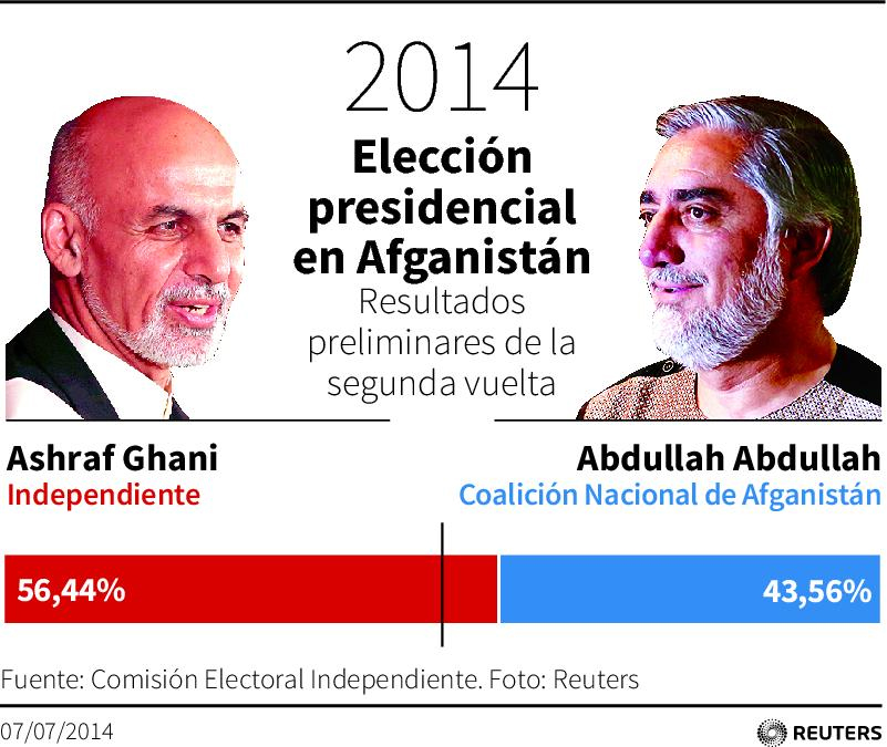 La Comisión Electoral de Afganistán (IEC) anunció ayer los resultados preliminares de la segunda vuelta de los comicios celebrada el 14 de junio y puso en cabeza a Gani con el 56.44 % de los votos, frente a los 43.56 % de Abdulá.
