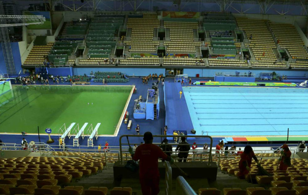 09/08/2016.- El agua de la piscina de saltos en el Centro Acuático Maria Lenk tenía un espléndido color azul el pasado lunes durante la final masculina de saltos sincronizados de trampolín de 10 metros. Sin embargo, el color mutó esta tarde a un sorprendente verde durante la final en categoría femenina. El cambió llamó la atención de algunos saltadores. El británico Tom Daley, bronce el día anterior, mostró su sorpresa en Twitter. «Ermmm… ¿Qué pasó?», se preguntaba.