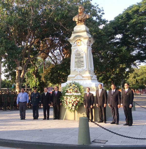 Como parte de la ceremonia, las autoridades montaron guardia de honor y depositaron una ofrenda floral ante el busto erigido a la memoria de Benito Juárez en el jardín que lleva su nombre.