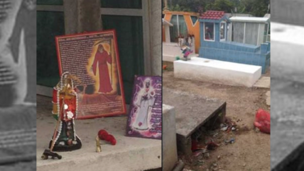 Villahermosa, Tabasco.- Varias figuras de la santa muerte, veladoras, esencias y hasta un sapo amarrado con un listón rojo, fueron encontrados en la bóveda del panteón que se ubica en la ranchería Moctezuma, municipio de Paraíso, en Tabasco, lo que ha generado una gran conmoción entre los habitantes de la comunidad.