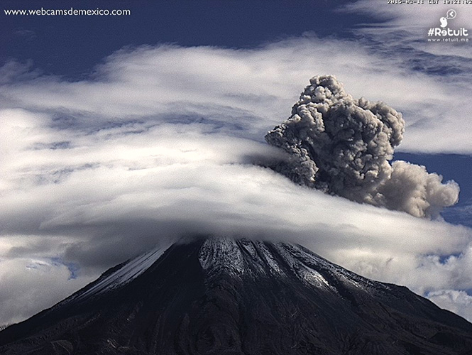Fotografías captadas por Webcams de México retratan además una nube lenticular que se mueve cerca del coloso, lo que le da más espectacularidad al evento.