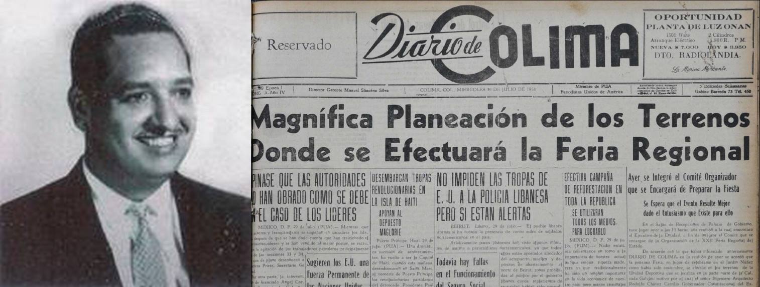 10688091_744276795621754_7635998518136808359_oImágenes: Izquierda. ingeniero arquitecto Rodolfo Chávez Carrillo, Gobernador Constitucional del Estado (1955-1961); Derecha: Hemeroteca del Diario de Colima. Edición del Miercoles 30 dejulio de 1958. Primera Plana.