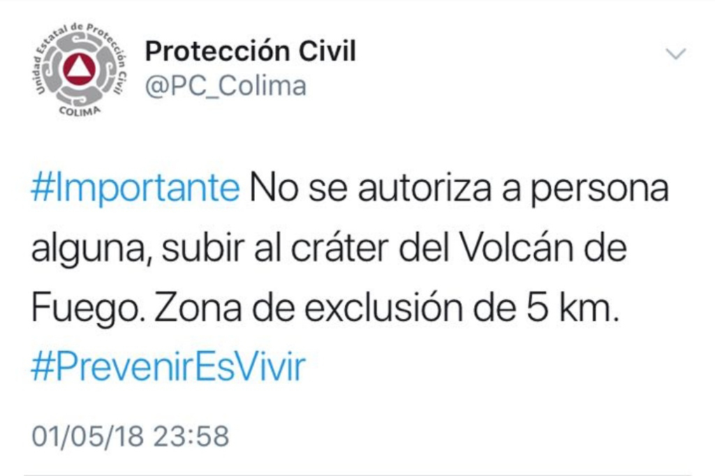 La cuenta oficial de twitter de Protección Civil de Colima publicó el pasado 1 de mayo que está vigente la zona de exclusión para cualquier persona a acercarse al volcán que desde hace dos años está en etapa eruptiva y representa un peligro para la vida humana en zonas cercanas al cráter.