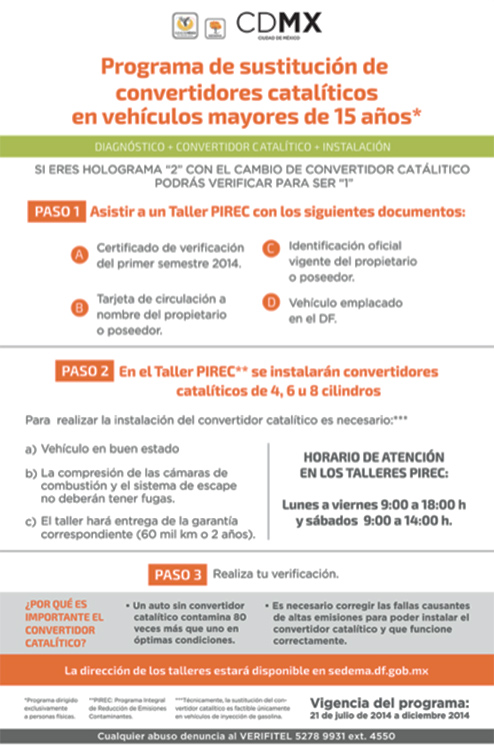 El jefe de Gobierno del Distrito Federal indicó que para la instalación de estos catalizadores habrá talleres especializados, los cuales se darán a conocer a través de la Secretaría del Medio Ambiente capitalina a la brevedad.