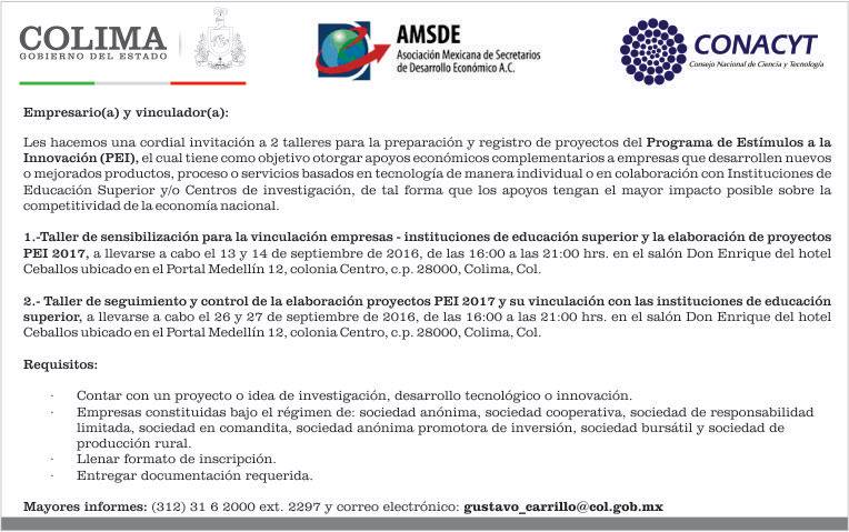Colima Medios 12/09/2016.- El Gobierno del Estado a través de la Secretaría de Fomento Económico, invita a los empresarios y vinculadores a los dos talleres para la preparación y registro de proyectos del Programa de Estímulos a la Innovación (PEI).