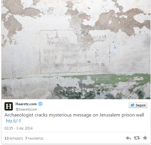 Shmuel Matza, exmiembro del Movimiento de Resistencia Judía, pasó en 1947 cuatro días en la prisión Kishle, que está situada junto a las murallas de la ciudad vieja de Jerusalén, informa ‘Haaretz’. En un acto simbólico de autodefensa talló su nombre y el emblema de la organización antibritánica en la que militaba en la pared de la cárcel. Pero lo que el combatiente no podría haber imaginado es que detrás del mensaje de Matza se encontraría una extraordinaria inscripción que, según los arqueólogos, data del siglo VIII antes de Cristo, es decir, perteneciente al período del Primer Templo.El descubrimiento se debe a Amit Re’em, quien decidió encontrar al autor de la inscripción contemporánea. «Dentro de la cárcel se halla toda la historia de Jerusalén», asegura el arqueólogo. Una planta más abajo los investigadores han encontrado una cuenca que pertenece, según sus estimaciones, a la época de los cruzados. Más allá han descubierto un canal que llega hasta el palacio de Herodes y la base del Palacio Mount Zion.Los investigadores, encabezados por Amit Re’em trabajan hoy en la decodificación del antiguo mensaje, que probablemente fue dejado por uno de los primeros prisioneros de la cárcel. El público puede contemplar de la inscripción en las excursiones que organiza el Museo Torre de David.