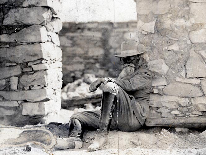 Una de las imágenes más poderosas del archivo es aquella donde se ve a Venustiano Carranza sentado, apoyando la espalda en el muro de una hacienda abandonada. La imagen fue captada en algún punto del norte del país, en marzo de 1913, luego de lanzar el Plan de Guadalupe y de renunciar a la gubernatura de Coahuila, desconociendo a Victoriano Huerta
