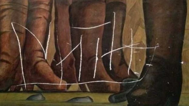 Woendolyne Hernández Corona, restauradora, dice que «hay alguien que vandalizó el mural, hizo un grafiti pero no como es usual, con spray o pintura, sino con algún elemento punzocortante sobre el muro».
