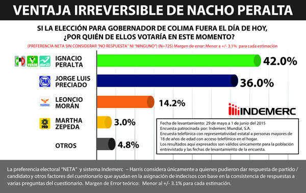 Una encuesta realizada por la firma Indemerc-Harris, fue presentada ayer en la noche por el director de la misma, Vicente Licona, quien en entrevista con José Cárdenas en el noticiero estelar de UNOTV, aseguró que en Colima se tiene una “ventaja significativa estadísticamente hablando a favor” del candidato Nacho Peralta.