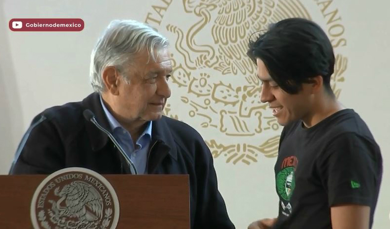 El joven subió al templete y le dijo algo al presidente, aunque el mandatario solo pidió una silla para que se sentara mientras el tabasqueño continuaba con su discurso.