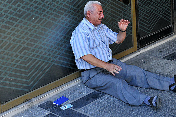 14361538303Giorgos Chatzifotiadis, un jubilado griego de 77 años guardó colas este domingo ante varios bancos en la ciudad de Salónica, Grecia, con la esperanza de retirar la pensión de su esposa. Al no conseguirlo, el hombre se derrumbó sobre el pavimento y se puso a llorar.