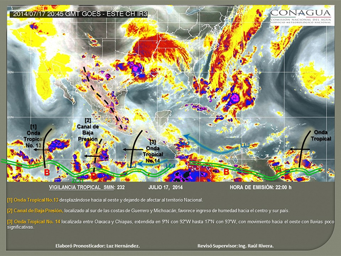 CIUDAD DE MÉXICO, 18 de julio.- La onda tropical número 14 se ubicará la mañana de este viernes al suroeste del país y se moverá dirección oeste, por la tarde afectará a oriente, sur y partes del centro con potencial de lluvias fuertes a muy fuertes en esas regiones y puntuales intensas en Oaxaca y Guerrero.