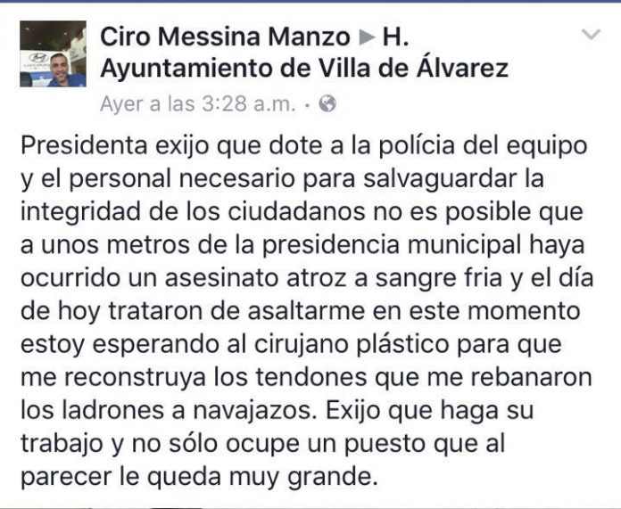 25/09/2016.- La madrugada de ayer sábado, una persona fue asaltada a pocos metros de la presidencia municipal de Villa de Álvarez, donde al tratar de defenderse lo ladrones destrozaron sus tendones.