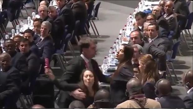 Dos mujeres irrumpieron el inicio de la sesión del Congreso electivo de la Federación Internacional de Fútbol (FIFA) para mostrar una tarjeta roja al presidente Joseph Blatter.