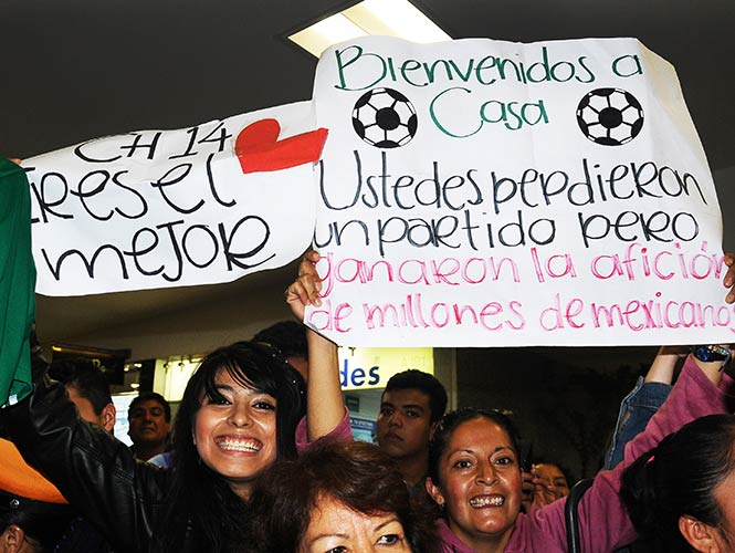 CIUDAD DE MÉXICO, 30 de junio.- Al menos mil aficionados que asistieron esta noche a la Terminal 1 del Aeropuerto Internacional de la Ciudad de México a darle la bienvenida a la Selección Mexicana, viven una fiesta, en la que los coros “Ochoa, Ochoa, Ochoa” y “México, México, México”, así como el Cielito Lindo, se escuchan en todas partes.