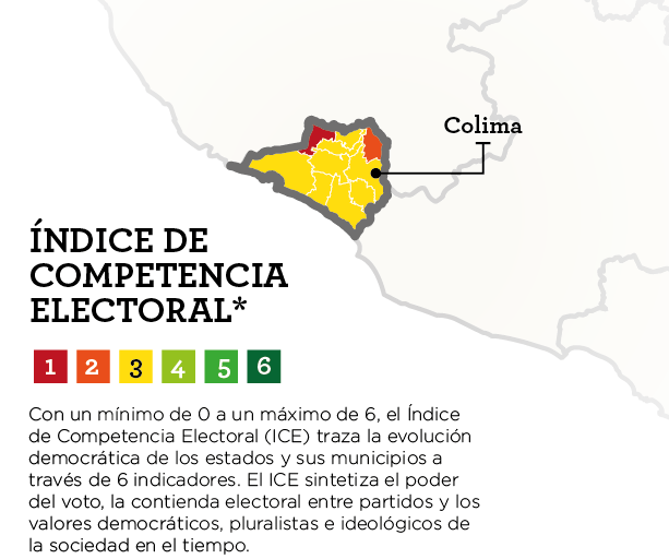 En cuanto a la competitividad electoral, Colima resultó el segundo más bajo con 2.7 puntos de 6, pues la entidad nunca ha tenido alternancia de partido a nivel estatal, sin embargo en este proceso electoral encuestas como Parametría han detectado apenas 7 puntos porcentuales de diferencia entre los dos principales contendientes, José Ignacio Peralta, del PRI con 42% y Jorge Luis Preciado, candidato del PAN con 35%.