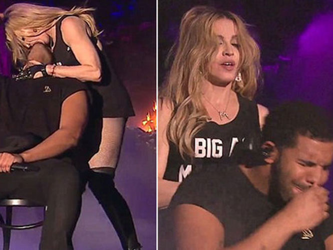 Todo sucedió cuando Madonna, invitada al show de Drake, se acercó hacia él, que la esperaba sentado en una silla sobre el escenario, y lo besó durante unos segundos. Él intentó deshacerse de la diva del pop, pero esta le apartó la mano para besarle a gusto, sin interrupciones.