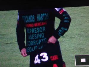 En medio del partido entre Pachuca y América correspondiente a la ida de los Cuartos de Final del Toreno Clausura 2015, y que vencen 3-2 los locales, un aficionado saltó a la cancha del Estadio Hidalgo para recordar a los 43 normalistas desparecidos meses atrás en Iguala.
