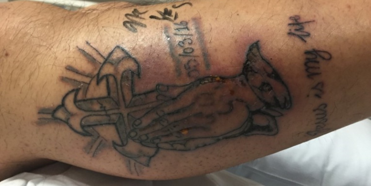 El hombre se había tatuado cinco días antes una cruz y unas manos rezando junto a la frase «Jesús es mi vida» en la pierna. Tres días después del baño, tuvo que acudir al hospital porque sentía mucho dolor en las piernas y los pies. Entre los síntomas, se encontraban fiebre y rojez alrededor del dibujo.