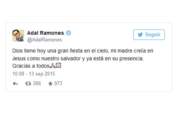 «Dios tiene hoy una gran fiesta en el cielo, mi madre creía en Jesus como nuestro salvador y ya está en su presencia. Gracias a todos».