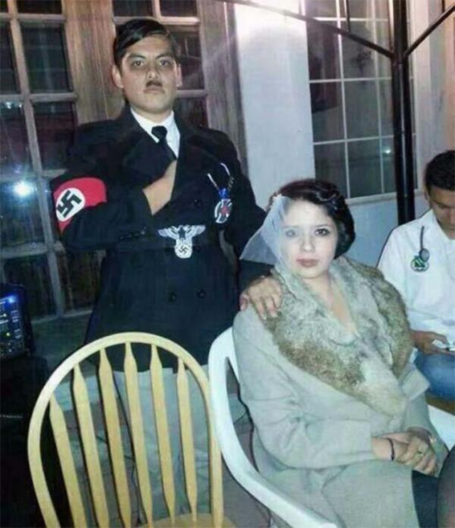 En las fotos, Escobedo aparece con pantalón gris, saco y corbata negra, con diversas insignias en el frente y con una banda roja en el brazo derecho, la cual contiene en un círculo blanco, la característica cruz gamada, símbolo del nazismo.Su acompañante, De la Rosa, aparece con un saco de color beige, peinado de época y un velo al frente, caracterizada como la esposa de Hitler.