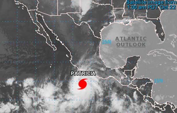 Distrito Federal.- El huracán Patricia se ubicará a 365 kilómetros al sur-suroeste de Tecpan de Galeana, Guerrero, y mantendrá nublados densos con potencial de lluvias intensas con puntuales torrenciales en Guerrero y Michoacán, intensas en Oaxaca, muy fuertes en Colima y Jalisco, así como fuertes en Nayarit.