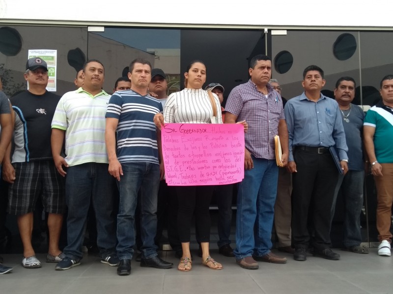 29/05/2019.- Elementos de la Policía Estatal de Colima se manifestaron en el Congreso del estado, debido a que desde del 29 de abril fueron cambiados del régimen obligatorio del Seguro Social, al voluntario, con lo que perdieron derechos y antigüedades de más de 29 años.