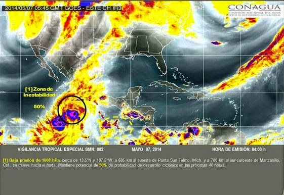 La Unidad Estatal de Protección Civil del Gobierno del Estado, informa que la baja presión, en estos momentos se encuentra localizada 480 Km al Sur–Suroeste de las costas de Colima, manteniendo la probabilidad de desarrollo ciclónico y la probabilidad de lluvias en el Estado en los próximos días.