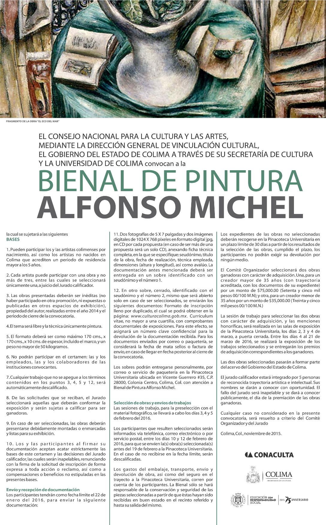 En un esfuerzo conjunto del Gobierno del Estado de Colima a través de su Secretaría de Cultura, el Conaculta mediante la Dirección General de Vinculación Cultural, así como la Universidad de Colima, se invita a pintores de larga y corta trayectoria a la Bienal de Pintura Alfonso Michel, bajo las siguientes bases: