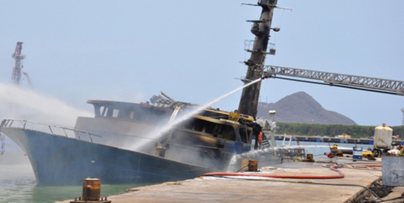 El atunero incendiado esta semi-hundido en muelles de Fondeport